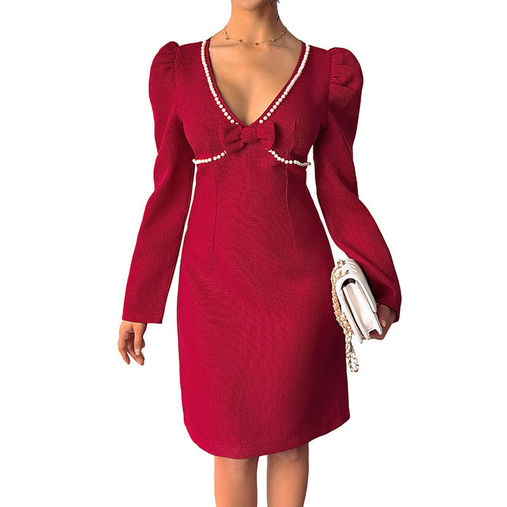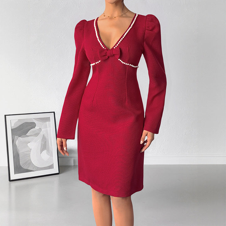 Retro Bow Pearl Deep V-Neck Red Dress – LuxeNova